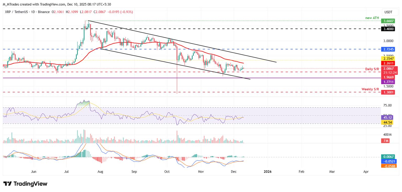 El precio de XRP encontró soporte en 1.96$ el domingo y subió un 3.66% en los siguientes dos días. Al momento de escribir el miércoles, XRP se mantiene alrededor de 2.08$.