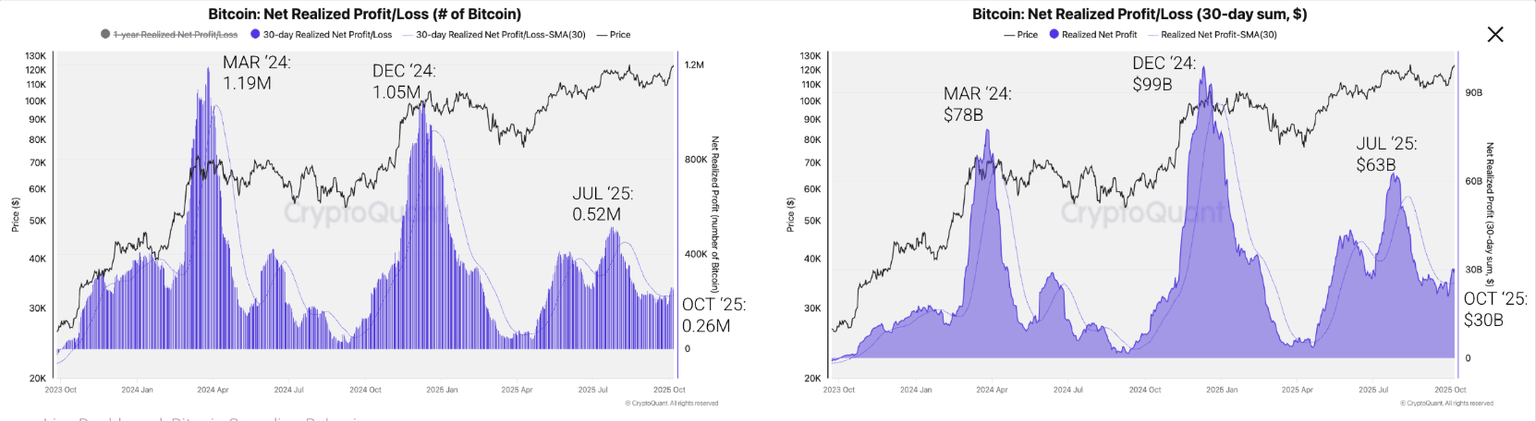 El gráfico a continuación muestra que los beneficios netos totales realizados de los tenedores de Bitcoin durante los últimos 30 días se sitúan en 0.26 millones de BTC el miércoles, equivalentes a un beneficio de 30.000 millones de dólares. Este nivel es un 50% inferior al pico anterior de julio de 0.52 millones de BTC o 63.000 millones de dólares de beneficio, y está lejos de los niveles de marzo y diciembre de 2024 de 78.000 y 99.000 millones de dólares de beneficios, respectivamente.