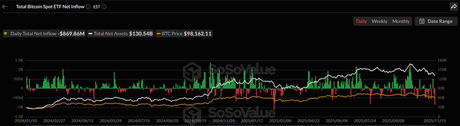 La estructura del mercado del Bitcoin (BTC) continúa deteriorándose a medida que la fase de capitulación comienza a tomar forma, con el BTC deslizándose por debajo de los 97.000$ el viernes y extendiendo las pérdidas a más del 7% hasta ahora esta semana. La demanda institucional sigue debilitándose, ya que los fondos cotizados en bolsa (ETFs) de Bitcoin al contado registraron una salida de 622,70 millones de dólares hasta el jueves, marcando la tercera semana consecutiva de retiros.
