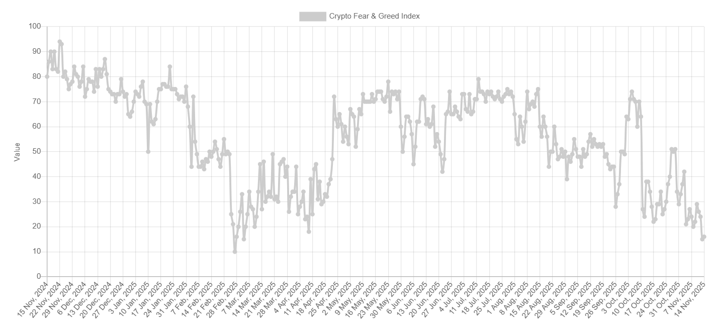 El Índice de Miedo y Avaricia cae a 16 el viernes, acercándose a los mínimos de principios de marzo, indicando un cambio brusco hacia el miedo extremo a medida que los participantes del mercado se preparan para más caídas.