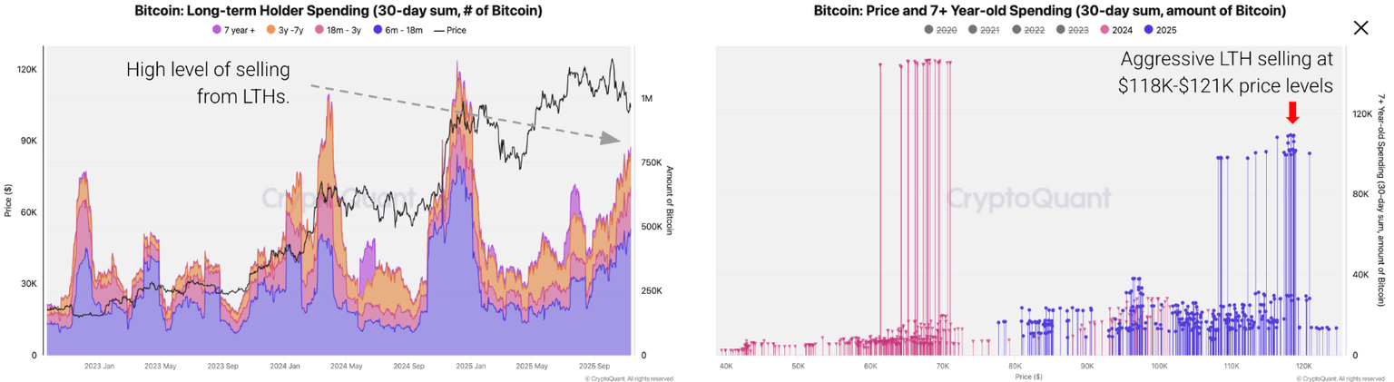 Además, los tenedores a largo plazo (LTHs) han vendido un total de 815.000 BTC en los últimos 30 días, el nivel más alto desde enero de 2024, añadiendo presión a la baja sobre el precio. Esta venta ha ocurrido en un momento en que la demanda al contado se debilitó/contrajo, como se observa en los flujos netos de salida de los ETFs de Bitcoin, una prima de precio negativa en Coinbase y una contracción en la demanda aparente. En episodios anteriores de altas ventas de LTHs, la demanda era lo suficientemente fuerte como para absorber esta oferta a precios más altos, pero este no es el caso actualmente. Los LTHs vendieron agresivamente en las zonas de precio de 118.000$ y 121.000$.