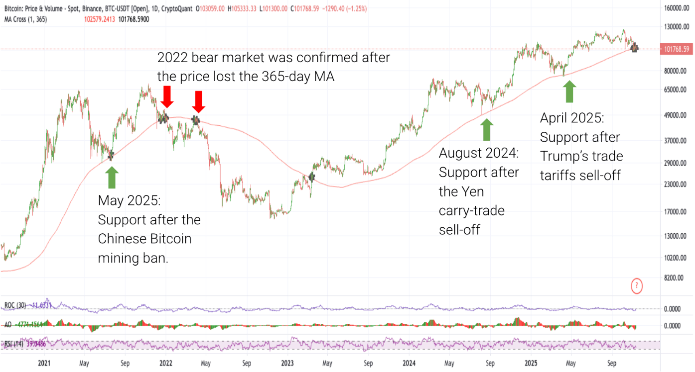 El informe concluyó que la media móvil de 365 días (MA) alrededor de 102.000$ es el nivel de soporte técnico y psicológico clave a observar, ya que ha actuado como nivel de soporte hasta ahora en este ciclo alcista (flechas verdes en el gráfico a continuación), y fue una de las últimas señales activadas cuando comenzó el mercado bajista en diciembre de 2021-enero de 2022. La incapacidad para recuperar la MA de 365 días podría acelerar una corrección más profunda. Notablemente, Bitcoin ha cerrado por debajo de la MA de 365 días en varias ocasiones durante el período actual, un fenómeno que no había ocurrido previamente en este mercado alcista. Si surge suficiente presión de venta, los próximos soportes de precio serían la banda de Valor de Red de Metcalfe 2x en 91.000$ y la banda de precio mínima de los Traders en 72.000$.
