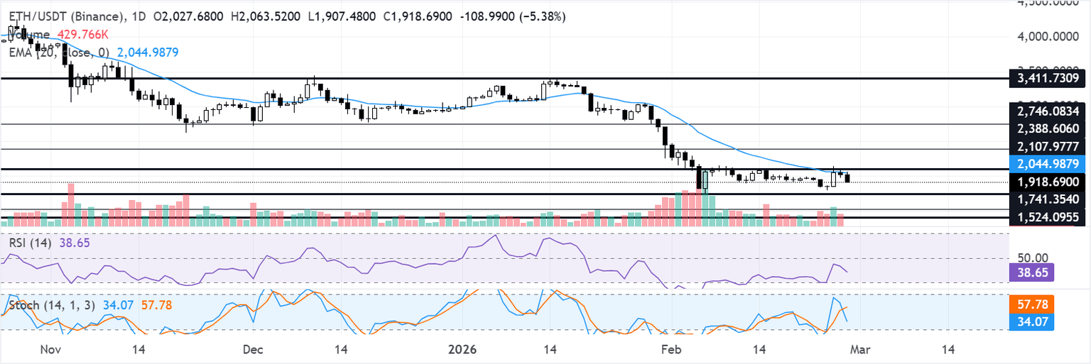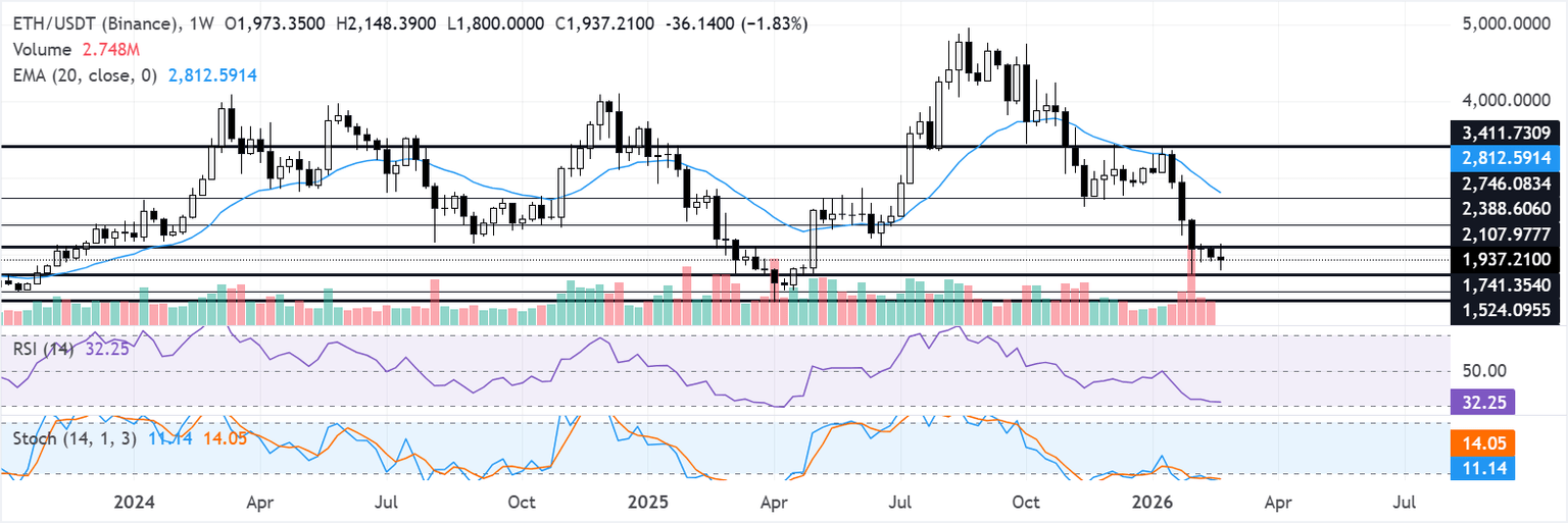 En el gráfico diario, ETH se mantiene por debajo de la media móvil exponencial (EMA) de 20 días cerca de 2.045$, preservando una estructura bajista más amplia a pesar del rebote desde los mínimos de la semana pasada. El índice de fuerza relativa (RSI) diario ha retrocedido hacia 39 después de recuperarse de territorio de sobreventa, indicando un desvanecimiento del impulso a la baja pero aún no un cambio hacia la presión alcista. El oscilador estocástico (Stoch) ha retrocedido de niveles de sobrecompra vistos a principios de esta semana, reforzando la opinión de que el reciente rebote es correctivo dentro de una tendencia bajista dominante.