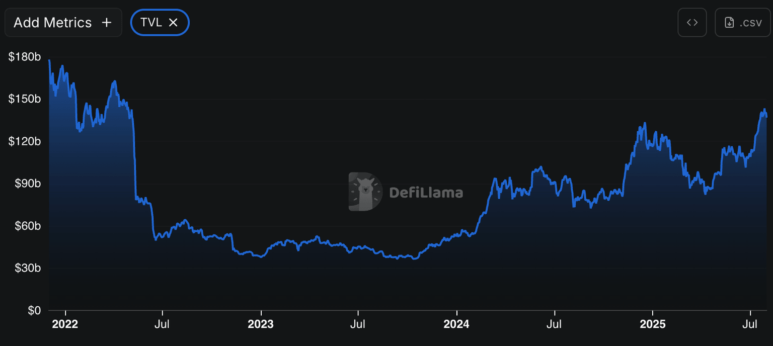 El valor total de los activos bloqueados en DeFi supera los 136 mil millones de dólares, según se observa en DeFiLlama. En mayo de 2022, el TVL de DeFi era de 138 mil millones de dólares, por lo que tomó más de tres años para que la métrica regresara a ese nivel.