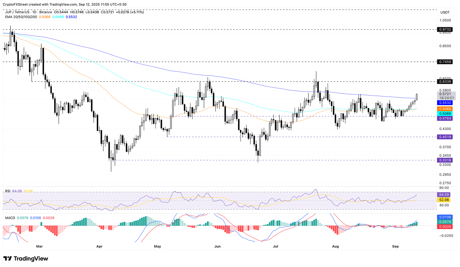 - Jupiter supera la EMA de 200 días con los alcistas apuntando a una recuperación adicional a 0.65$.