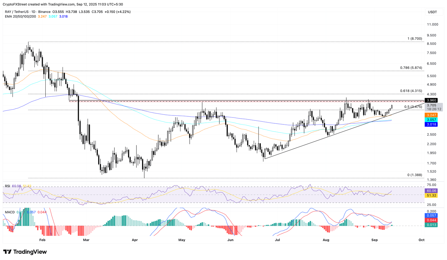 Raydium avanza un 4% en el momento de la publicación el viernes, extendiendo el rebote desde la media móvil exponencial (EMA) de 50 días en 3.247$. El token DEX basado en Solana apunta a la zona de suministro de 3.960$, actuando como la línea de tendencia superior.