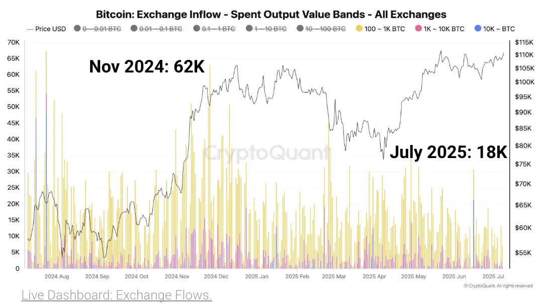 El Bitcoin se está negociando en condiciones peculiares, con la presión de venta permaneciendo significativamente moderada a pesar de que el precio se recuperó a un nuevo máximo histórico el jueves. Según CryptoQuant, la entrada total diaria de Bitcoin en los intercambios ha caído a 18.000 BTC, el nivel más bajo desde abril de 2015.