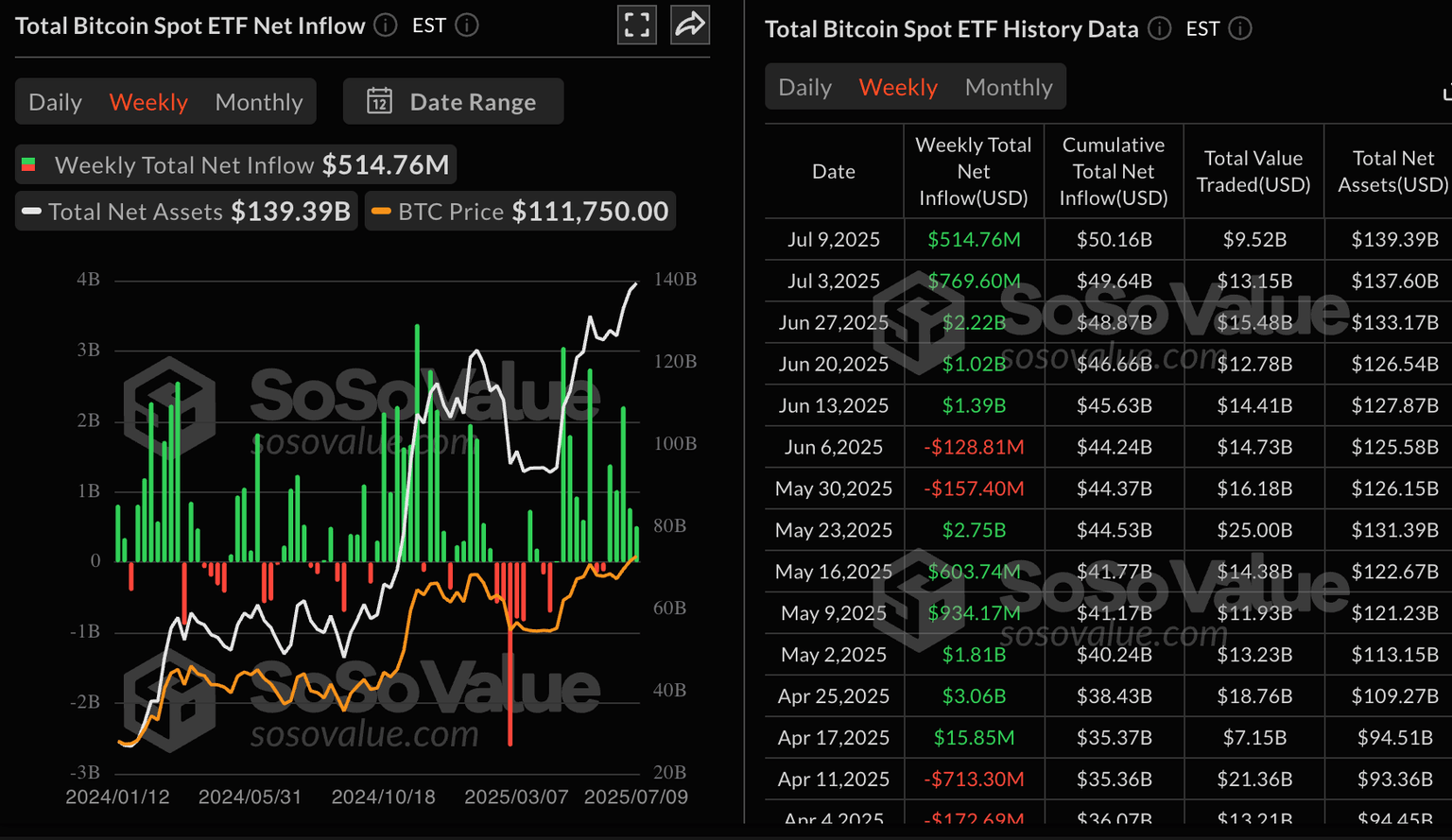 La tendencia alcista está en marcha, con aproximadamente 515 millones de dólares ingresando esta semana, como se ve en el gráfico a continuación. Mientras tanto, el volumen total neto de entrada acumulado ha superado la marca de los 50.000 millones de dólares, con activos netos promediando 139.4 mil millones de dólares.