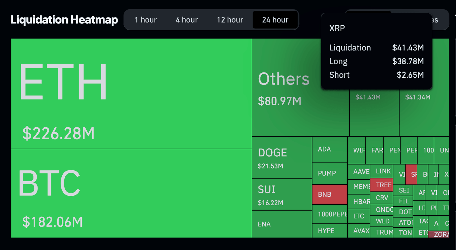 El mercado de derivados de XRP está inestable tras la prolongada corrección desde el máximo histórico. Los datos de CoinGlass destacan liquidaciones por un total de 41.4 millones de dólares en las últimas 24 horas, con los tenedores de posiciones largas representando la mayor parte, con 39 millones de dólares.