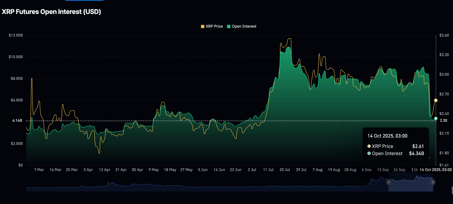 Por otro lado, el interés minorista en XRP se ha estabilizado en los últimos días. Sin embargo, sigue siendo significativamente inferior al nivel visto durante el evento de desapalancamiento de la semana pasada, que provocó liquidaciones masivas. El Interés Abierto (OI) de futuros de XRP promedia 4.34 mil millones$ el martes, después de aumentar a aproximadamente 9 millones$ el 7 de octubre.