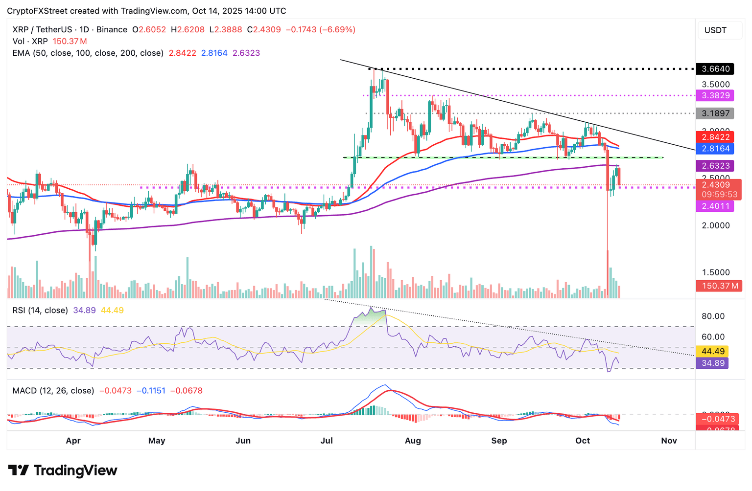 El precio de XRP ha estado golpeando el soporte de 2.40$ a corto plazo el martes, tras un rechazo del máximo del día anterior alrededor de la media móvil exponencial (EMA) de 200 días en 2.63$ en el gráfico diario.