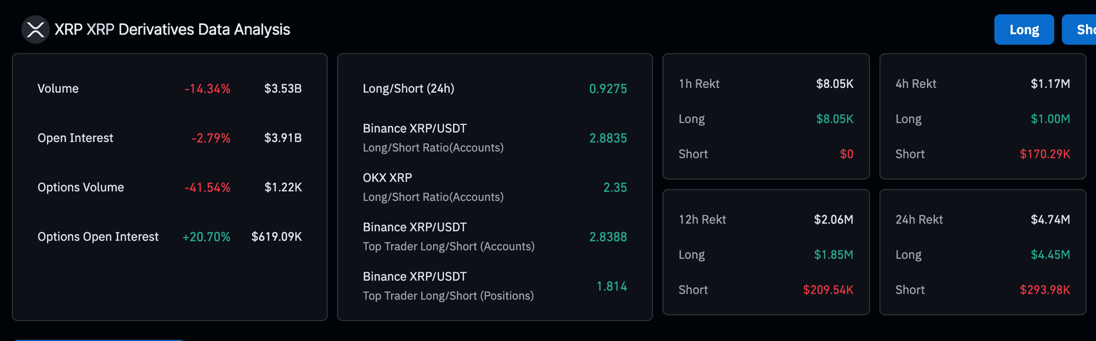 El mercado de derivados de XRP exhibe signos de una posible tendencia bajista prolongada, principalmente debido a una disminución en el interés abierto (OI) y el volumen de negociación. Según los datos de CoinGlass, el OI disminuyó casi un 3% a 3.91 mil millones de dólares en las últimas 24 horas. Esta caída coincide con una caída más amplia del 14% en el volumen de negociación a 3.53 mil millones de dólares, señalando una disminución en el interés de los operadores en XRP y una baja participación en el mercado.