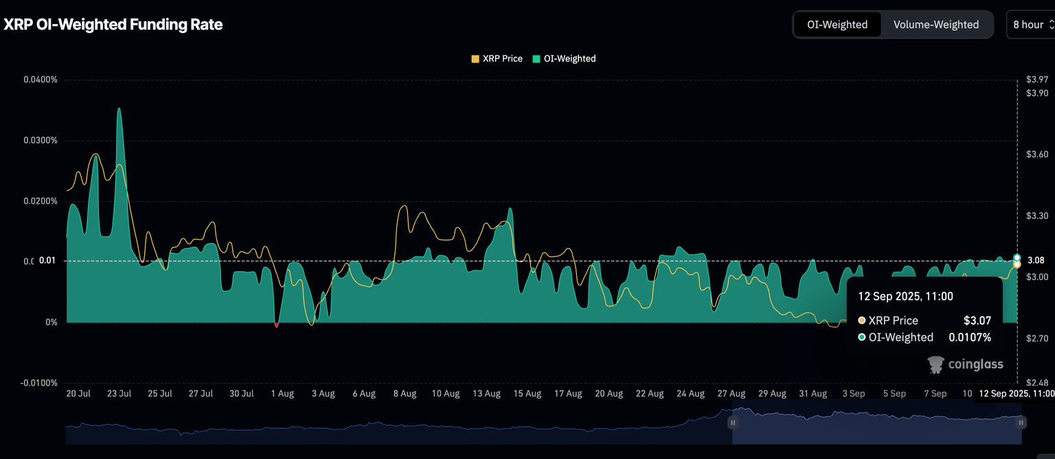 La tasa de financiación ponderada por futuros también está aumentando de manera constante, promediando 0.0107% el viernes, lo que refuerza el sentimiento positivo del mercado. Este sólido aumento en el OI, como se muestra en el gráfico a continuación, implica que más traders están apalancando posiciones largas en XRP, anticipando aumentos de precios a corto plazo.