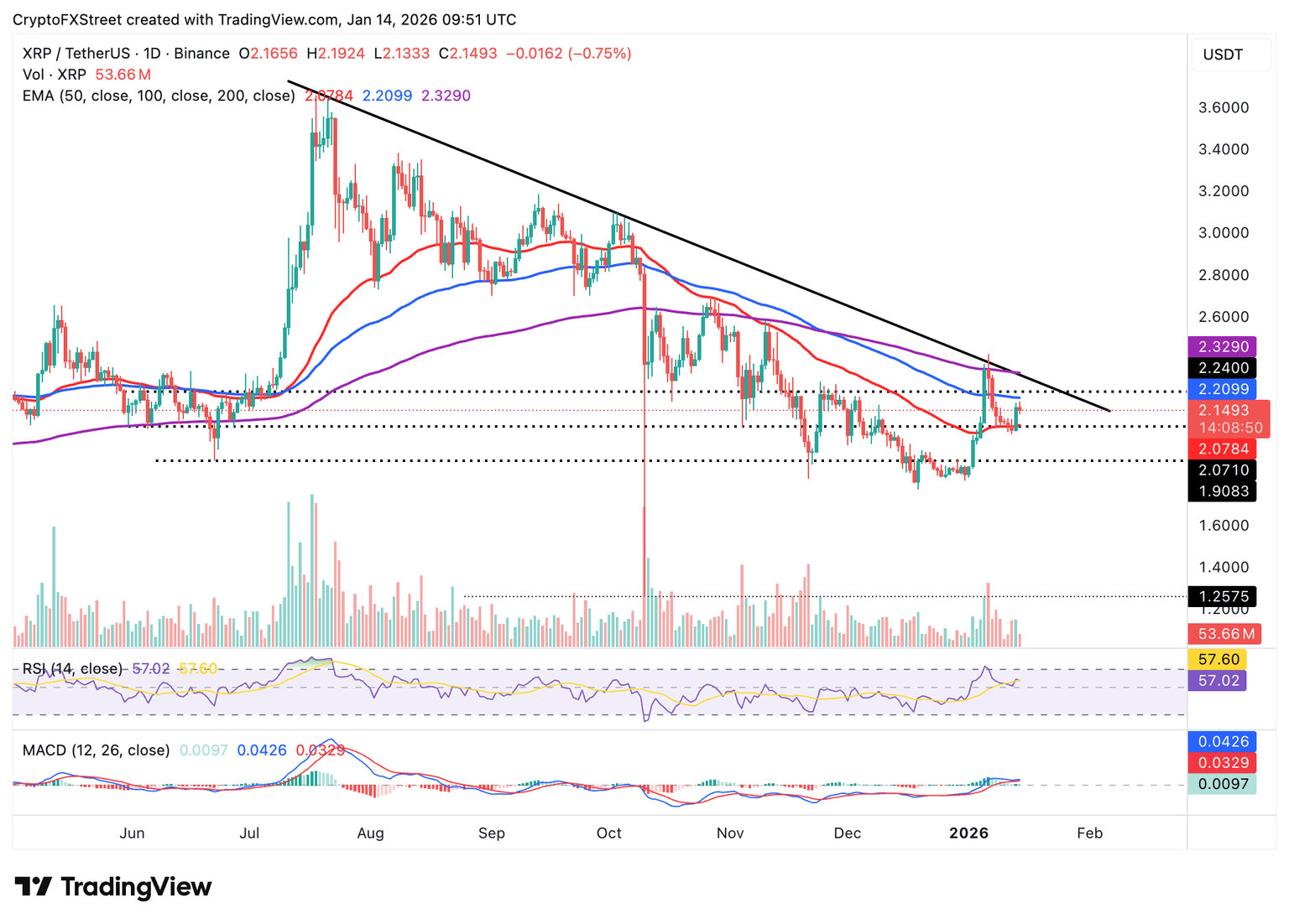 XRP se cotiza entre un soporte clave proporcionado por la media móvil exponencial (EMA) de 50 días en 2.08 $ y la EMA de 100 días en 2.21 $ en el momento de escribir este artículo el miércoles.