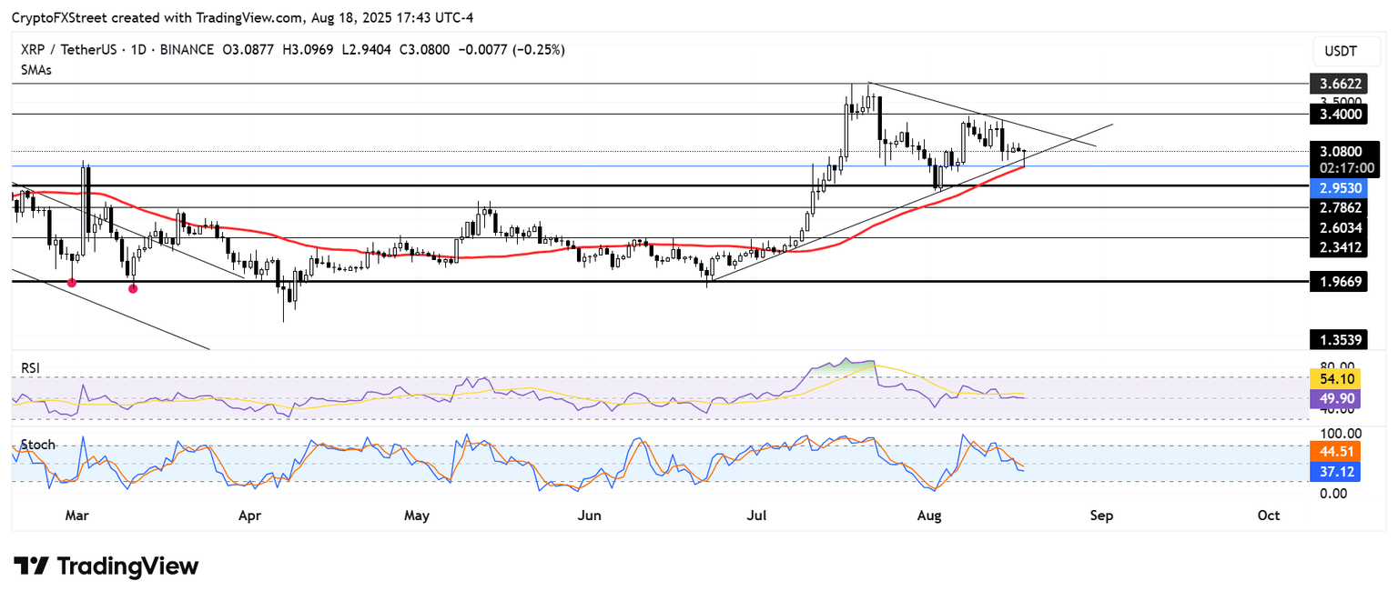 - XRP rebotó en la SMA de 50 días después de una breve caída por debajo de 3$ el lunes.