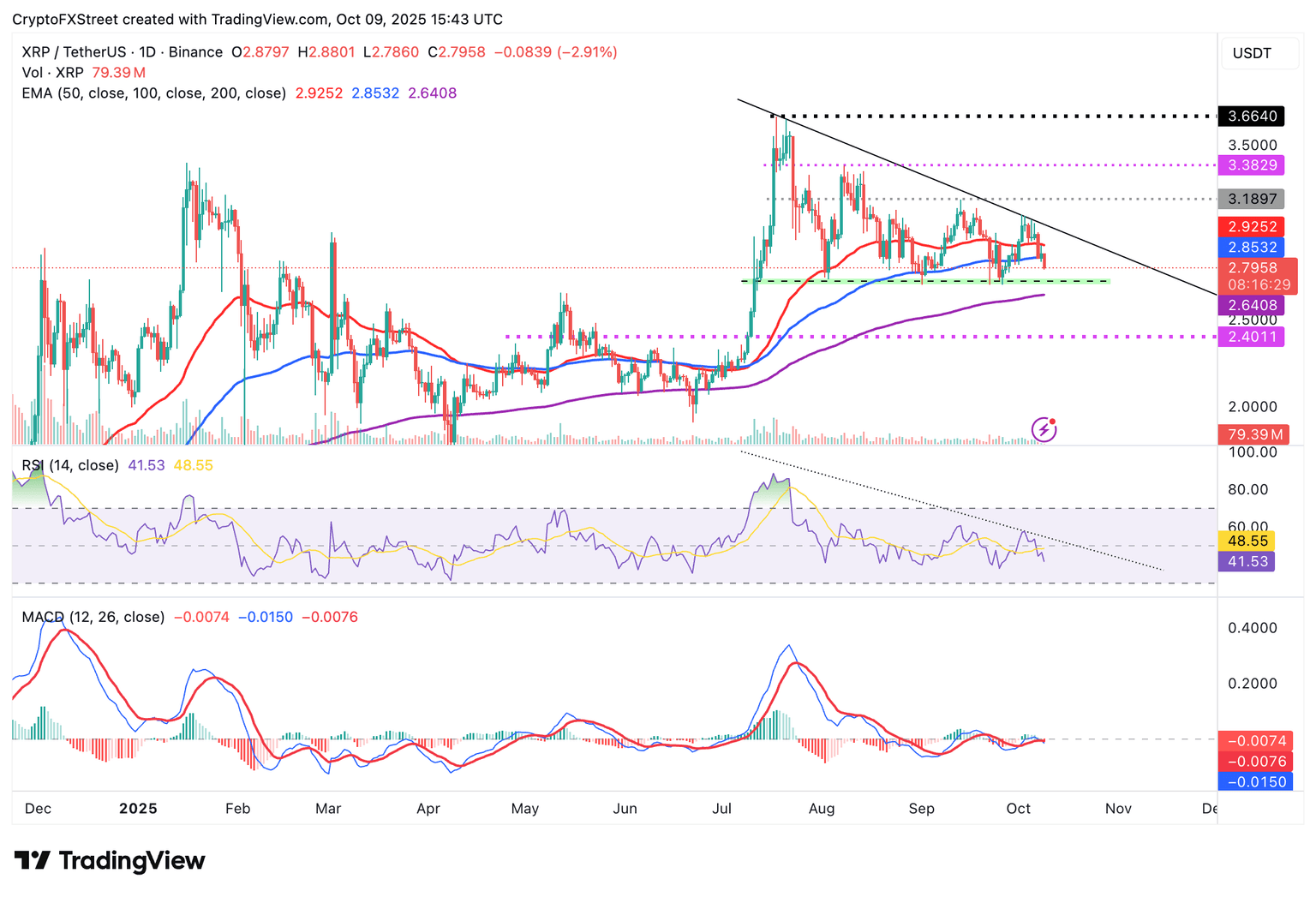 Ripple (XRP) cotiza en medio de una creciente presión de venta el jueves, reflejando un sentimiento de aversión al riesgo y un aumento en las actividades de toma de beneficios en el mercado de criptomonedas en general. En el momento de escribir, XRP cotiza a 2.79$, con una caída del 3% en el día.