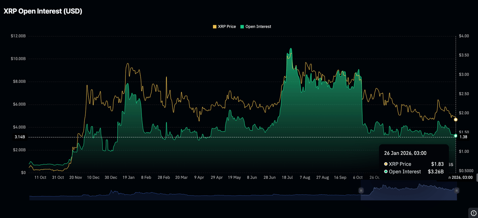 XRP continúa enfrentando un mercado de derivados débil a medida que el sentimiento de aversión al riesgo se extiende por el espacio cripto. Los datos de CoinGlass muestran que el interés abierto (OI) promedia 3.260 millones de dólares el lunes, por debajo de los 3.400 millones de dólares del día anterior y de los 4.550 millones de dólares del 6 de enero.