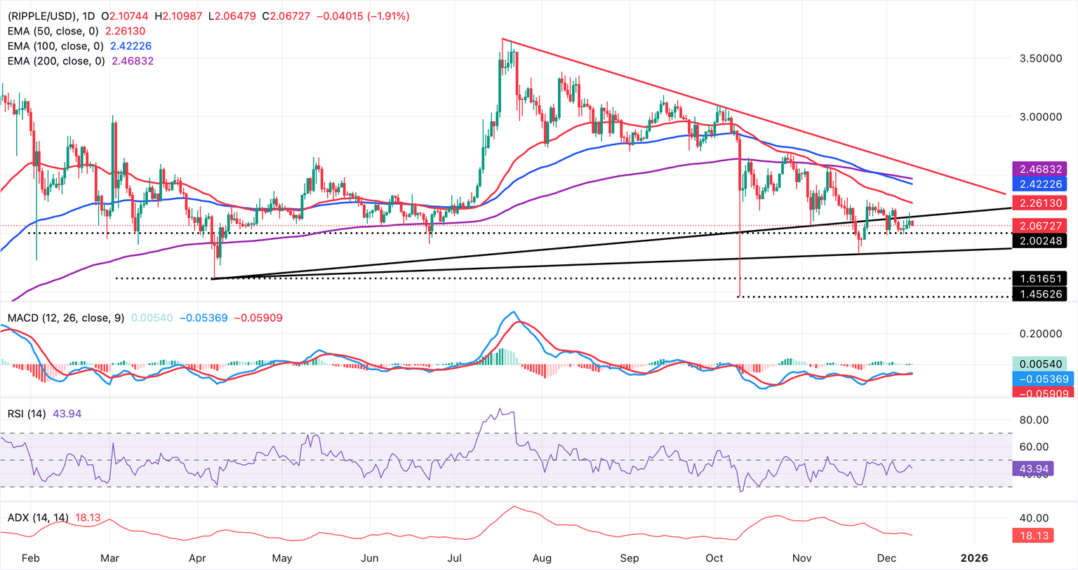 XRP cotiza a 2.06$ en el momento de escribir el miércoles, bajando desde la apertura del día en 2.10$. El token de remesas de dinero transfronterizas también se sitúa por debajo de la media móvil exponencial (EMA) de 50 días en 2.26$, la EMA de 100 días en 2.42$ y la EMA de 200 días en 2.46$, que mantienen una perspectiva bajista a medida que descienden y limitan los rebotes.