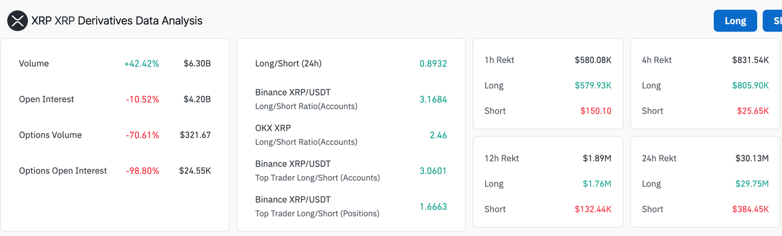 - El retroceso de XRP sacude a los débiles, con liquidaciones alcanzando los 30 millones de dólares en las últimas 24 horas.