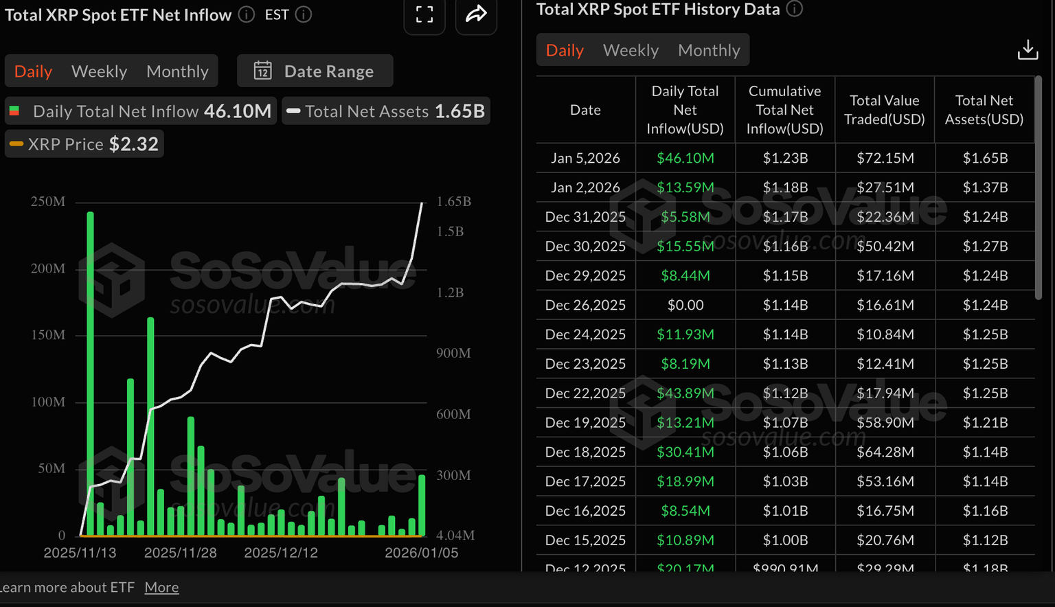 Los flujos hacia los ETFs de XRP al contado listados en los Estados Unidos (EE.UU.) se dispararon a 46 millones de dólares el lunes, extendiendo la racha alcista desde aproximadamente 13.6 millones de dólares el viernes. Los datos de SoSoValue muestran que el interés en los cinco productos ETF de XRP se mantiene constante, con un flujo acumulado de 1.23 mil millones de dólares y activos netos de 1.65 mil millones de dólares.