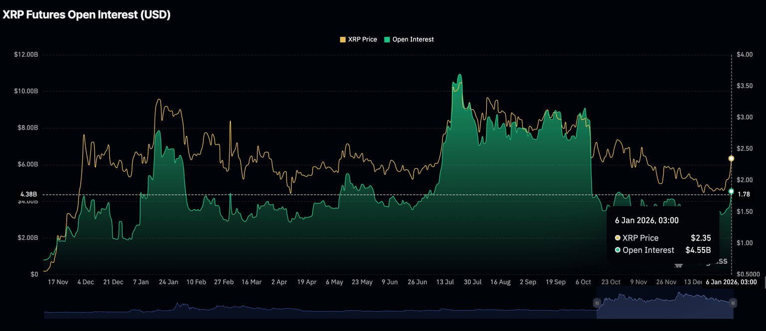 El mercado de derivados de XRP, por otro lado, también está experimentando un resurgimiento en la demanda minorista, lo que ha impulsado el crecimiento en el interés abierto de futuros (OI). Los datos de CoinGlass muestran que el OI, que representa el valor nocional de los contratos de futuros pendientes, promedia 4.55 mil millones de dólares el martes, desde 3.77 mil millones de dólares el lunes.
