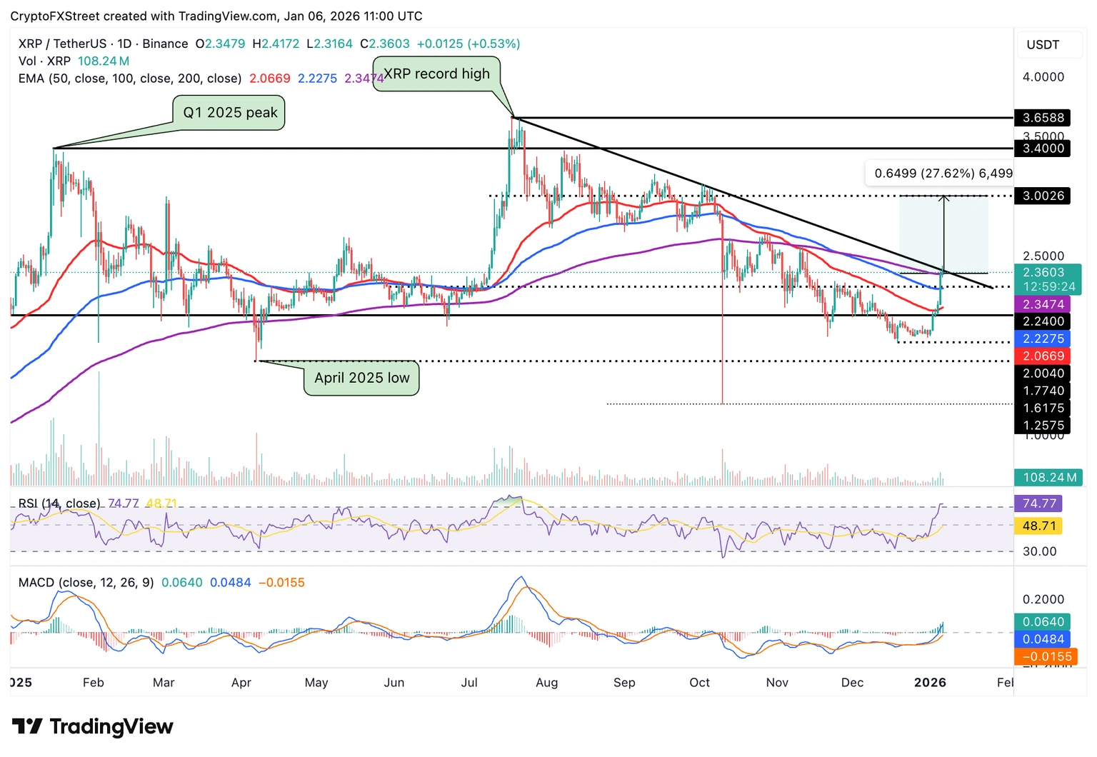 XRP está cotizando por encima de la media móvil exponencial (EMA) de 200 días, que se sitúa en 2.35$ en el momento de escribir este artículo el martes. Aunque una línea de tendencia descendente desde el máximo histórico de 3.66$ limita el alza inmediata, indicadores técnicos clave, incluido el MACD en el gráfico diario, respaldan la perspectiva alcista de XRP.