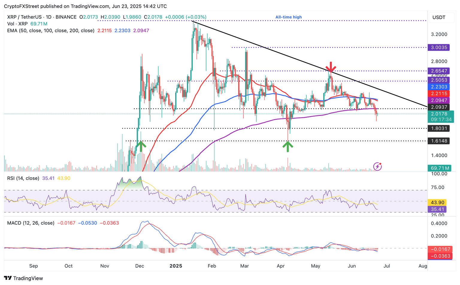 XRP lucha por mantener el soporte en 2.00$ en medio de la volatilidad impulsada por factores macro debido a la escalada del conflicto entre Israel e Irán. A pesar de los sólidos fundamentos, incluido el interés institucional constante y la disminución de las reservas de intercambio, el token permanece por debajo de un nivel clave de soporte convertido en resistencia en 2.09$, proporcionado por la media móvil exponencial (EMA) de 200 días.