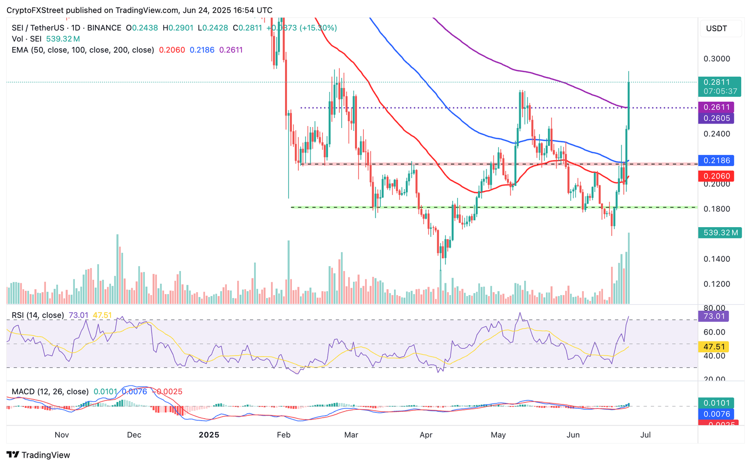 Sei continúa extendiendo la notable recuperación, marcando un repunte cercano al 78% desde su reciente mínimo de 0.15$, alcanzado el 17 de junio. El token está posicionado por encima de la media móvil exponencial (EMA) de 200 días, actualmente en 0.26$, solidificando aún más la tendencia alcista.