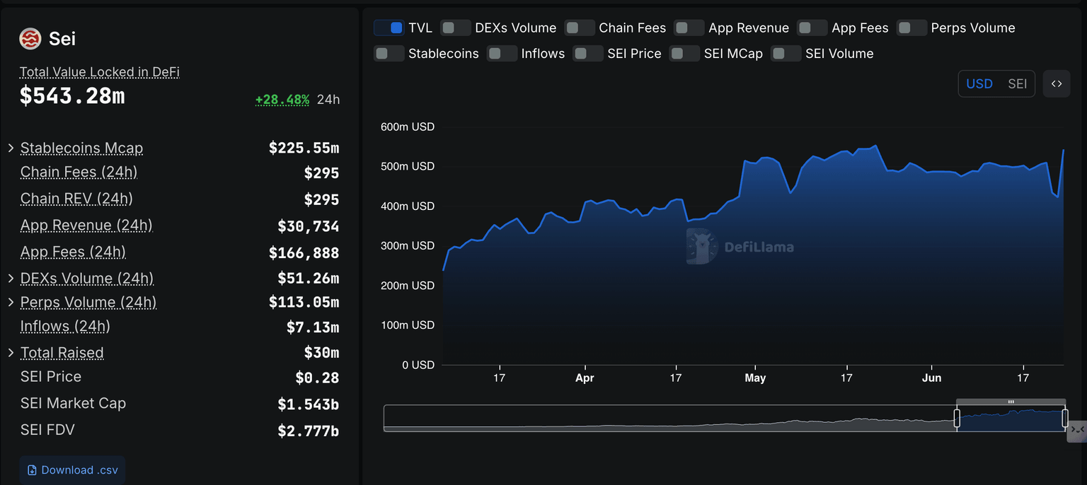 Posteriormente, el Valor Total Bloqueado (TVL) de Finanzas Descentralizadas (DeFi) de Sei se disparó a 543 millones de dólares, marcando un aumento del 28% en 24 horas.