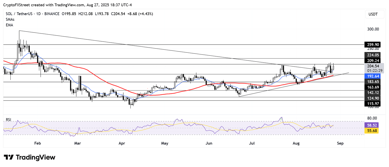 SOL ha subido un 5% en las últimas 24 horas, cotizando alrededor de 205$ en el momento de la publicación. La cuarta altcoin más grande está probando la resistencia de 209$ mientras apunta a un posible movimiento hacia 224$.