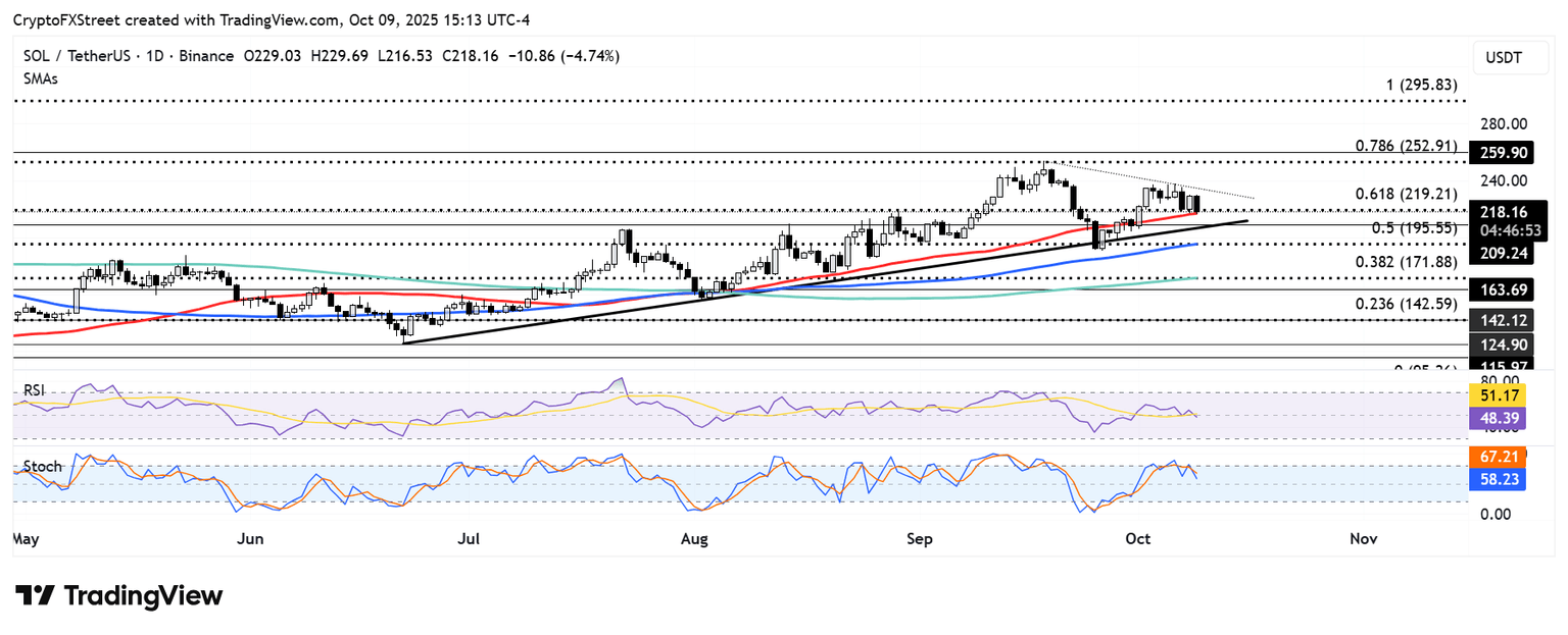 SOL ha bajado un 5% el jueves tras una caída más amplia del mercado de criptomonedas. La altcoin está probando el nivel de retroceso de Fibonacci del 61.8% alrededor de 219$ y la media móvil simple (SMA) de 50 días.