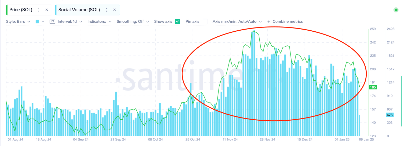 Según los datos de Santiment, el dominio social de Solana ha seguido tendiendo a niveles inusualmente altos, a pesar del reciente retroceso del precio.