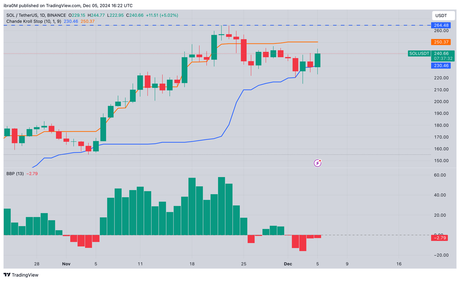 El indicador Chande Kroll Stop destaca una resistencia inmediata en 250$, lo que sugiere que SOL podría tener dificultades para superar este nivel en el corto plazo.