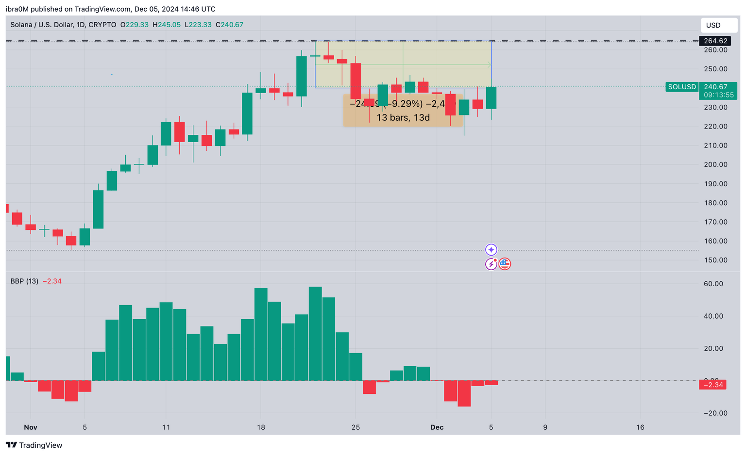 - A pesar de que el Bitcoin superó los 100.000$, el indicador Bull Bear Power (BBP) de Solana muestra un debilitamiento del impulso de compra.