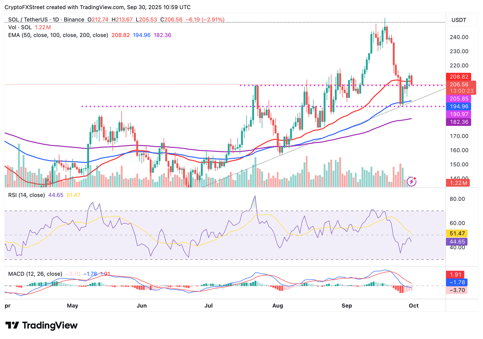 Solana (SOL) está cotizando a la baja alrededor de 206$ en el momento de escribir este artículo el martes, reflejando una corrección saludable tras un aumento constante desde el fin de semana hasta el lunes.