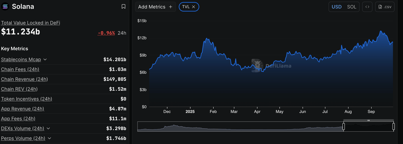 La Finanzas Descentralizadas (DeFi) de Solana alcanzó un nuevo máximo histórico en el Valor Total Bloqueado (TVL) el 14 de septiembre, con 13.22 mil millones de dólares mantenidos en contratos inteligentes a través de todos los protocolos en la cadena. Sin embargo, la extrema volatilidad en el mercado de criptomonedas en general, que coincidió con la caída del precio desde máximos alrededor de 250$, culminó en una fuerte caída a 10.78 mil millones de dólares el viernes.