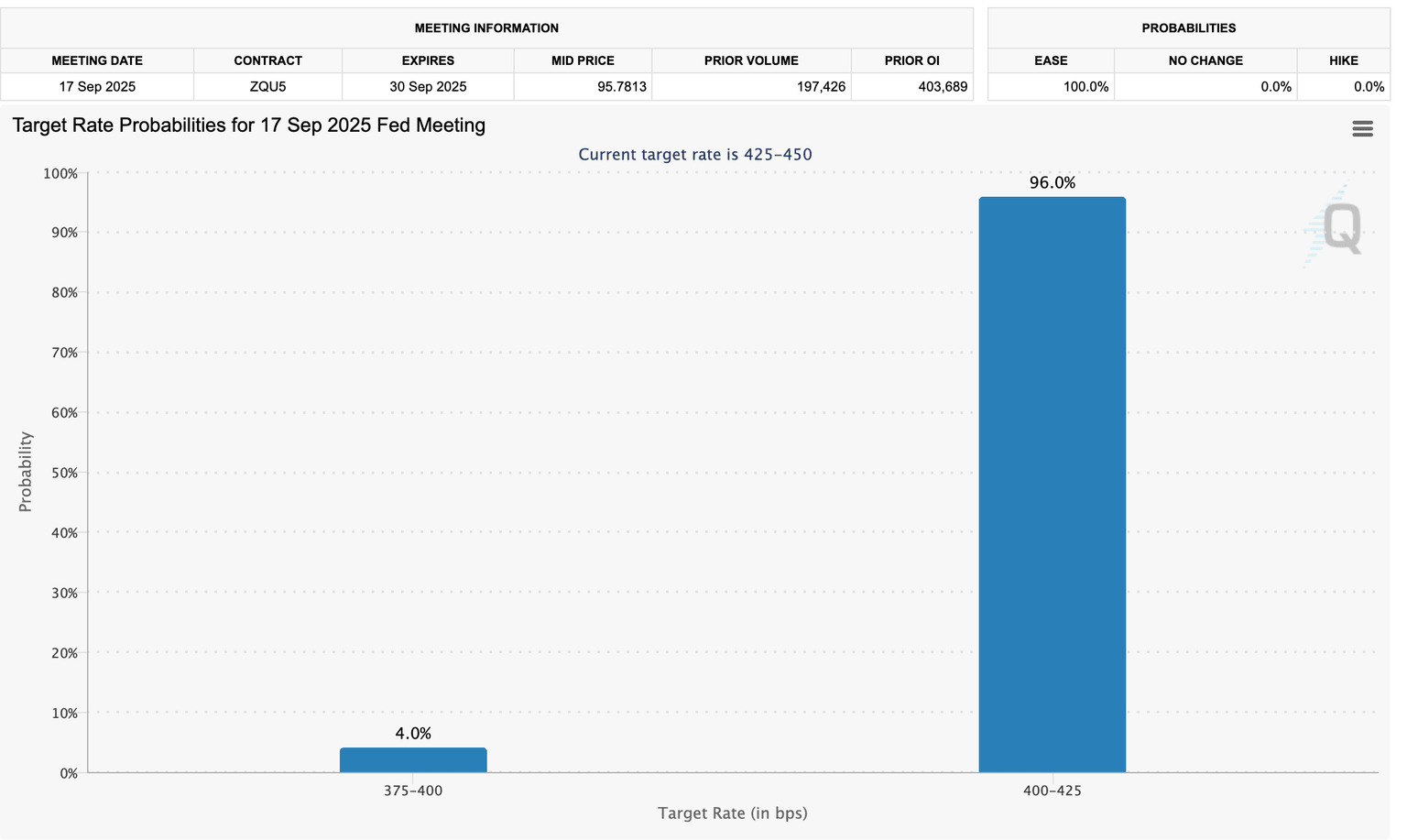 La herramienta FedWatch del CME Group muestra que los participantes del mercado están un 96% a favor de que la Fed recorte las tasas al rango de 4.00% a 4.25%. El resto de los participantes del mercado espera un recorte de 50 puntos básicos.