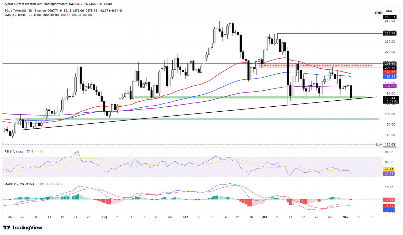 Solana cotiza a 175$ en el momento de la redacción el lunes, después de una pérdida intradía de más del 6%, arriesgando la zona de demanda de 174$-177$ y una línea de tendencia de soporte formada al conectar los mínimos del 1 de julio y del 10 de octubre.
