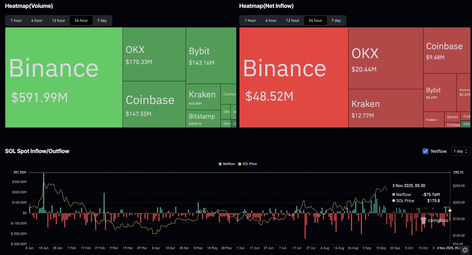 Agregando más margen, los flujos netos intradía en el mercado al contado muestran una salida neta de 75.76 millones$ en Solana hasta ahora el lunes. Esto indica que los traders están capitalizando precios descontados o trasladando tokens de los intercambios a almacenamiento en frío, reflejando confianza en Solana.