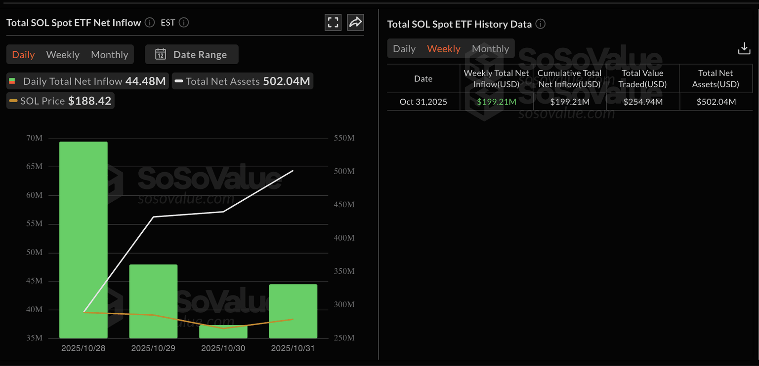 A pesar de la disminución de la demanda minorista que mantiene a SOL al borde, el lanzamiento de los ETFs de Solana al contado en EE.UU. la semana pasada muestra una demanda institucional constante para el principal competidor de Ethereum. Los datos de Sosovalue muestran cuatro días consecutivos de entradas la semana pasada, sumando 199.21 millones$ para la semana que finalizó el 31 de octubre. Si la tendencia constante continúa esta semana, la demanda de los jugadores institucionales podría elevar los precios de SOL.