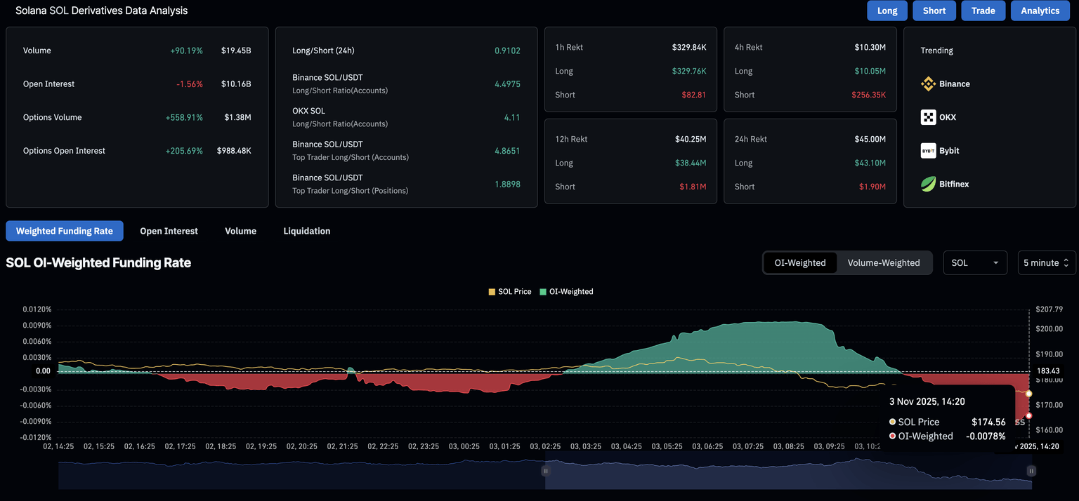 El precio de Solana (SOL) ha bajado más del 6% en el momento de la redacción el lunes, presionando la zona de soporte de 174$-177$ después de revertir desde la media móvil exponencial (EMA) de 200 días. Los datos de derivados sugieren una inclinación bajista entre los traders que anticipan más pérdidas.