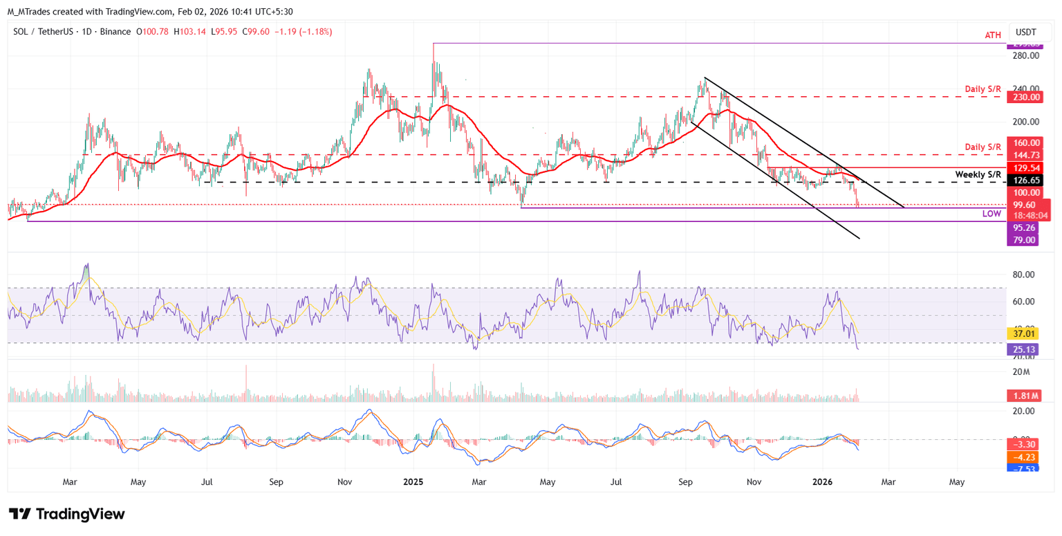 Solana Previsión del Precio: SOL cae por debajo de los 100$, arriesgándose a una corrección más profunda
