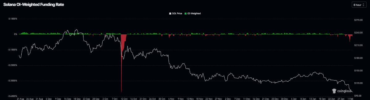 Los datos de derivados para Solana respaldan un panorama bajista. Los datos de la Tasa de Financiación Ponderada por OI de Coinglass muestran que el número de traders que apuestan a que el precio de SOL caerá más es mayor que aquellos que anticipan un aumento del precio.