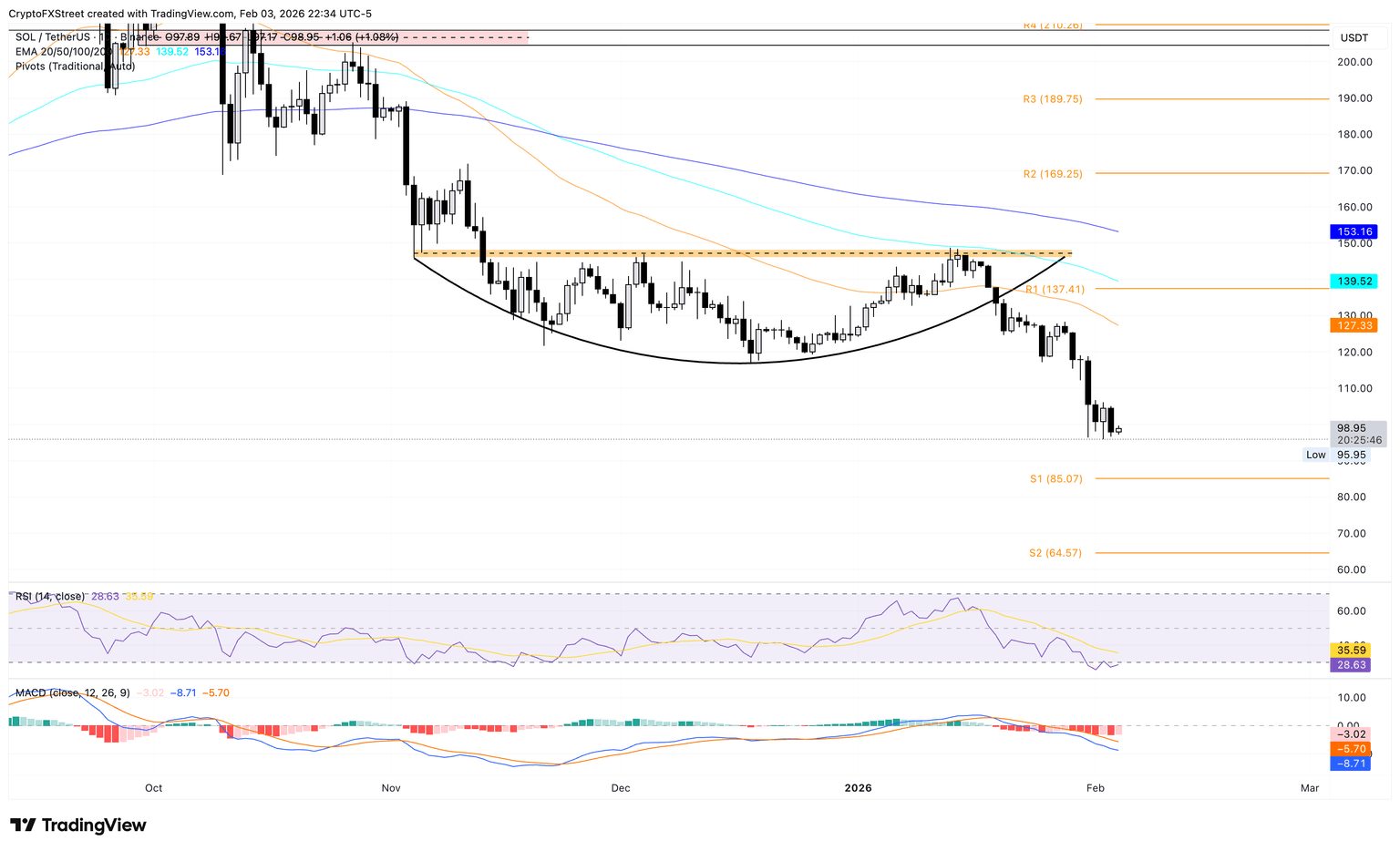 Si SOL cae por debajo de 95$, el camino de menor resistencia apunta al Punto de Pivote S1 en 85$.