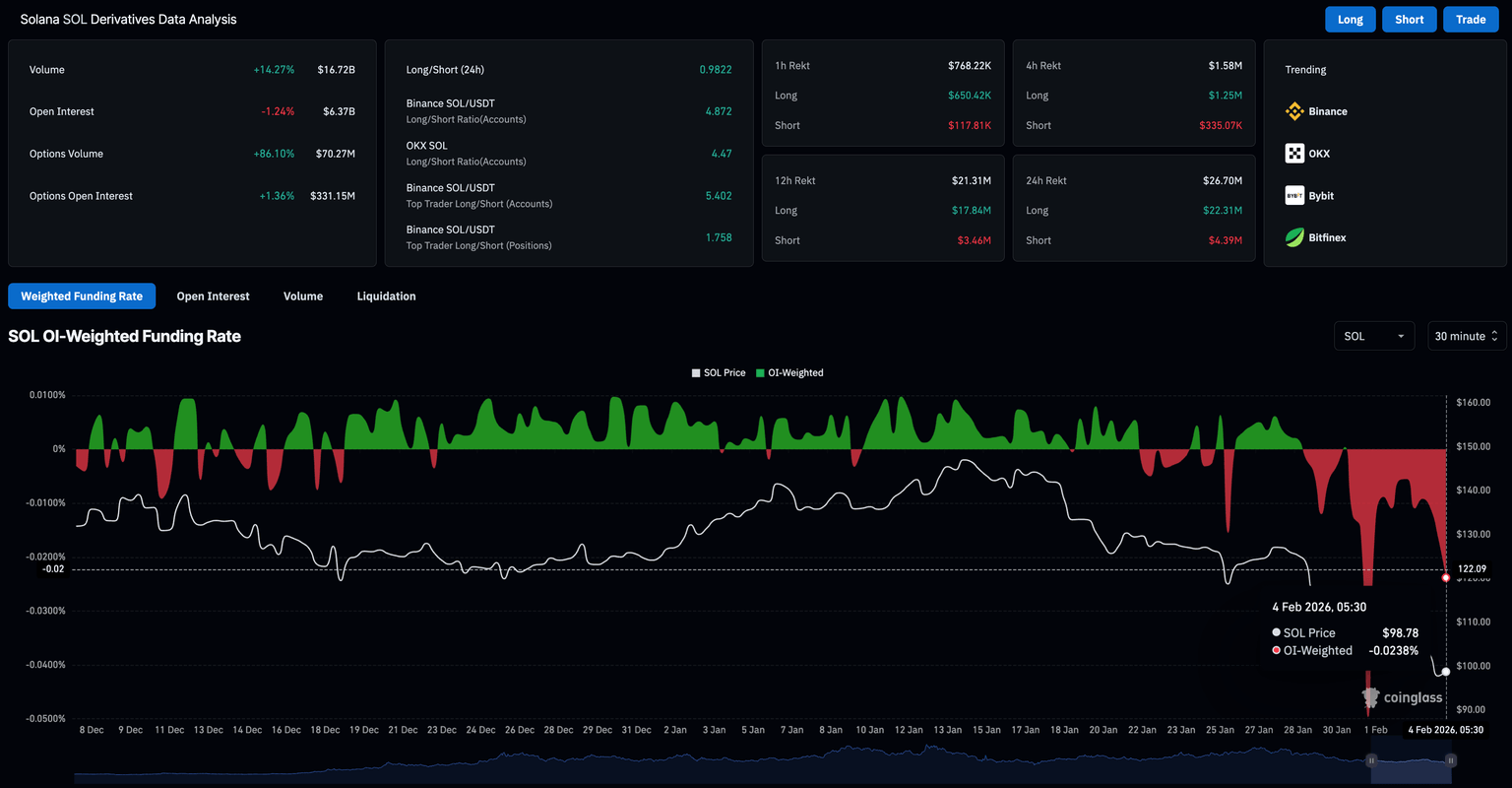 Mientras tanto, el mercado de derivados indica un sentimiento bajista hacia Solana en medio de salidas de capital. Los datos de CoinGlass muestran que el Interés Abierto (OI) de SOL disminuyó un 1,24% en 24 horas a 6.370 millones de dólares, indicando que el capital fue retirado ya sea a través de cierres de posiciones o reduciendo posiciones apalancadas.