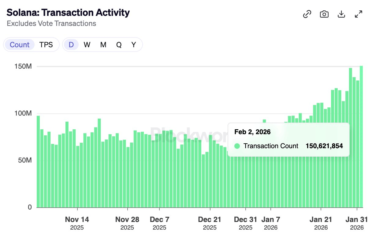 Solana mantiene la demanda en cadena entre los usuarios a medida que el conteo de transacciones diarias alcanza un máximo histórico el martes. Los datos de Blockworks muestran que Solana registró más de 150 millones de transacciones el martes, con 1.743 transacciones realizadas por segundo (TPS).