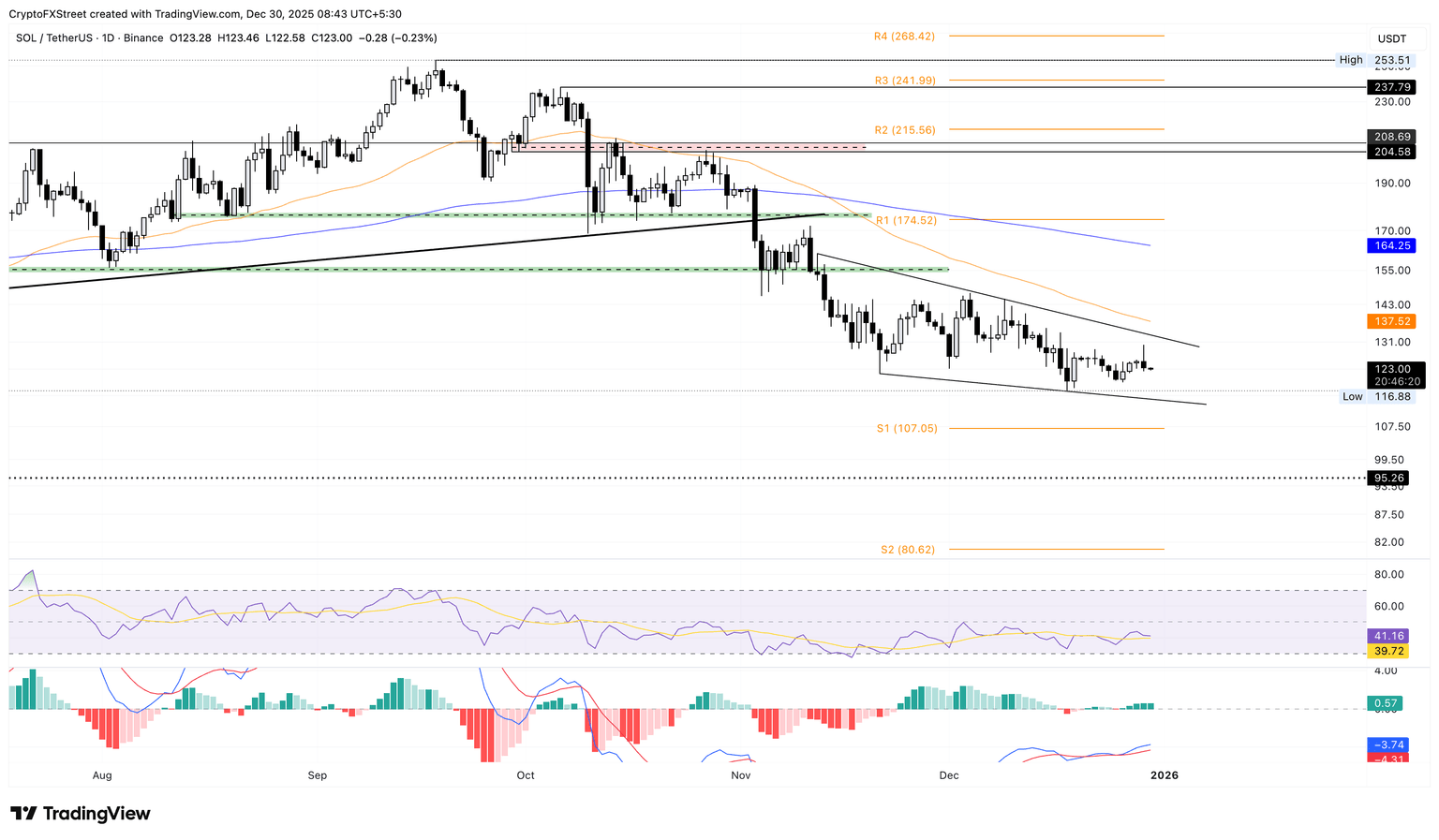 - Solana se mantiene por encima de 120$ tras una caída de casi un 2% el lunes, arriesgando una corrección adicional en un patrón de cuña descendente.