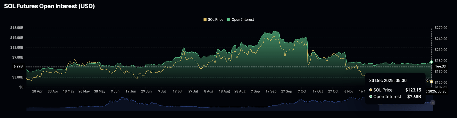 En el lado de los derivados, el sentimiento minorista se inclina hacia una estrategia del lado vendedor. Los datos de CoinGlass muestran que el Interés Abierto (OI) de futuros de SOL – valor nocional total de posiciones activas – está en 7.68 mil millones de dólares el lunes, subiendo de 7.54 mil millones de dólares el día anterior. Esto sugiere que los traders están inyectando nuevo capital en los derivados de Solana.