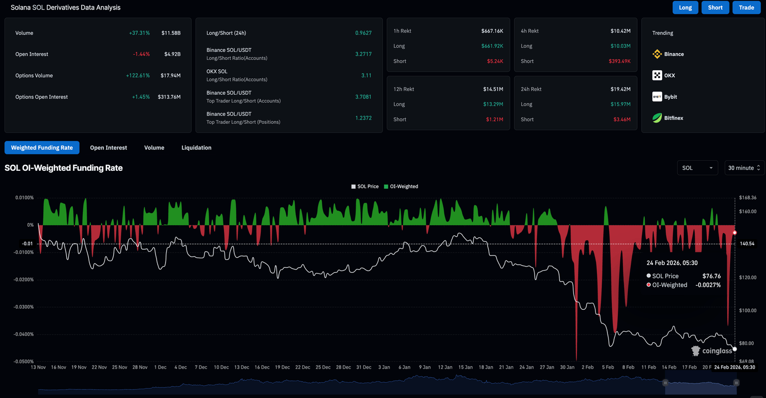 Solana se acerca al nivel de retroceso de Fibonacci del 23.6% basado en tendencias en 75.74$, medido desde el máximo del 13 de enero en 148.74$ hasta el máximo del 15 de febrero en 91.26$, incluyendo el mínimo del 6 de febrero en 67.50$.