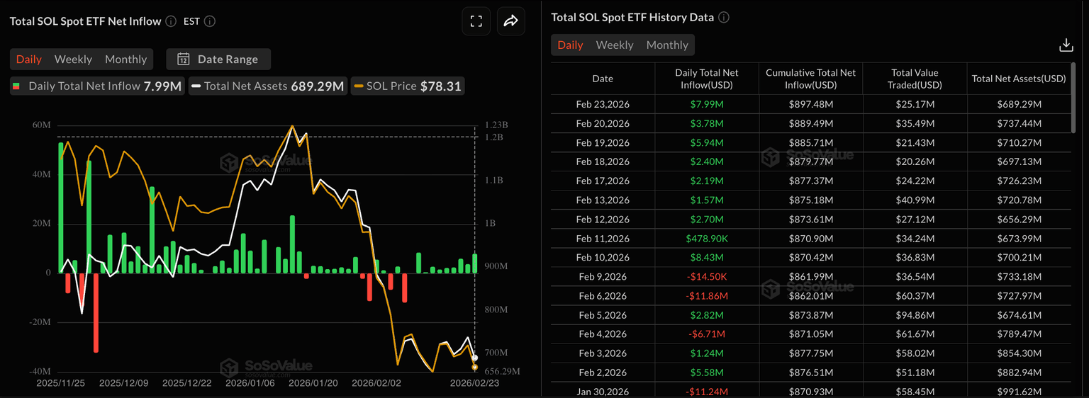 Solana sigue siendo una opción constante para los inversores institucionales a pesar del estrés en el mercado más amplio. Los ETFs de Solana al contado en EE.UU. registraron 7.99 millones de dólares en entradas el lunes, extendiendo la racha de acumulación durante la novena sesión de negociación consecutiva.